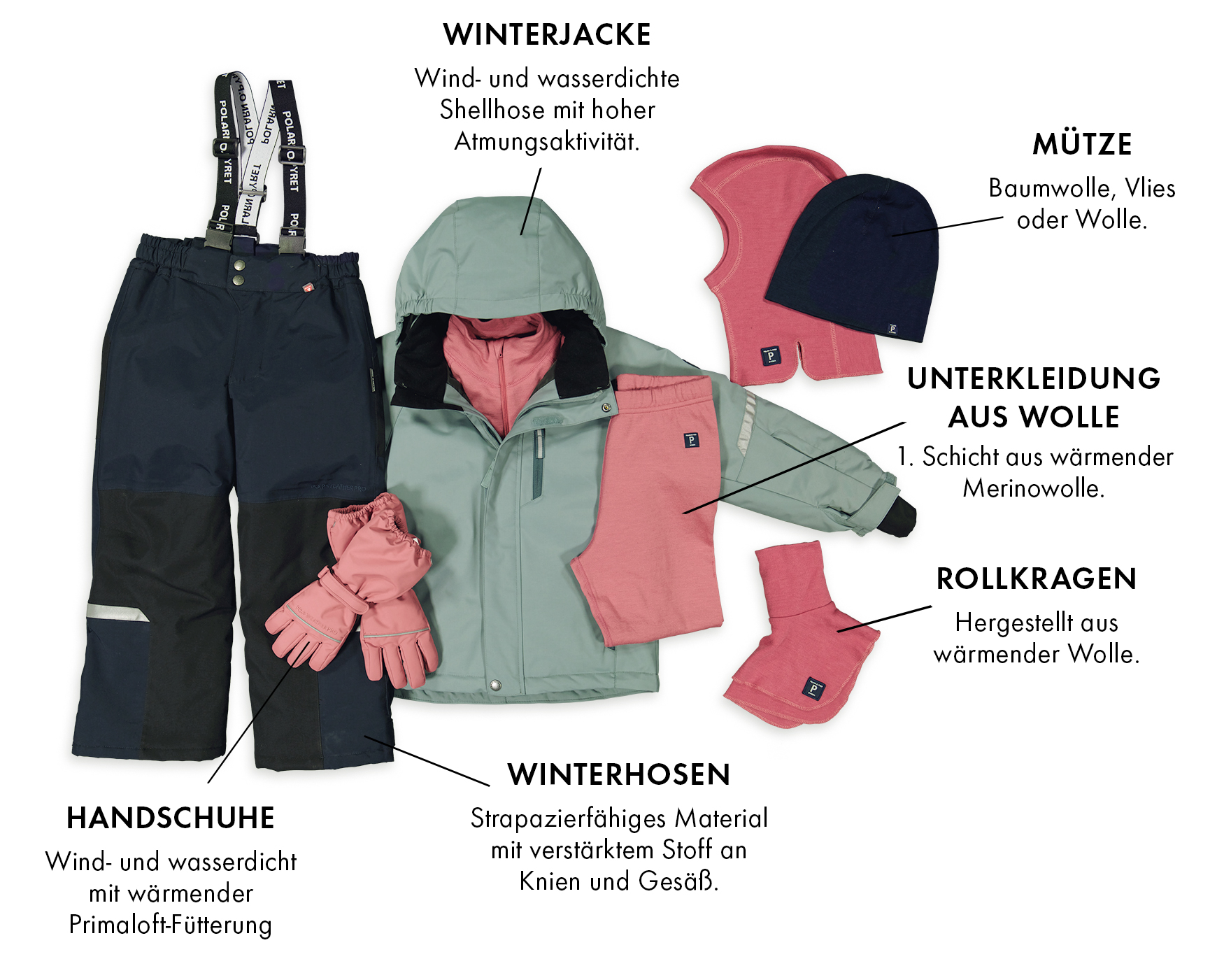 - 2. Schicht - Wärmende Zwischenschicht zur Isolierung aus Fleece oder Wollfrottee, um die Kinder den ganzen Tag über warm zu halten.
